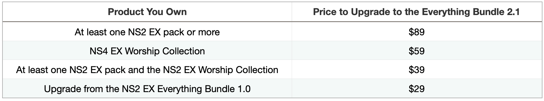 **These discounts only apply to the Everything Bundle that applies to the keyboard you the packs/collections you purchased are designed for. They don’t count toward upgrading to Everything Bundles for newer model keyboards. For example, if you purchased the Nord Stage 3 Worship Collection, it’s not possible to use that Collection for upgrade pricing to move up to the Nord Stage 4 Everything Bundle.